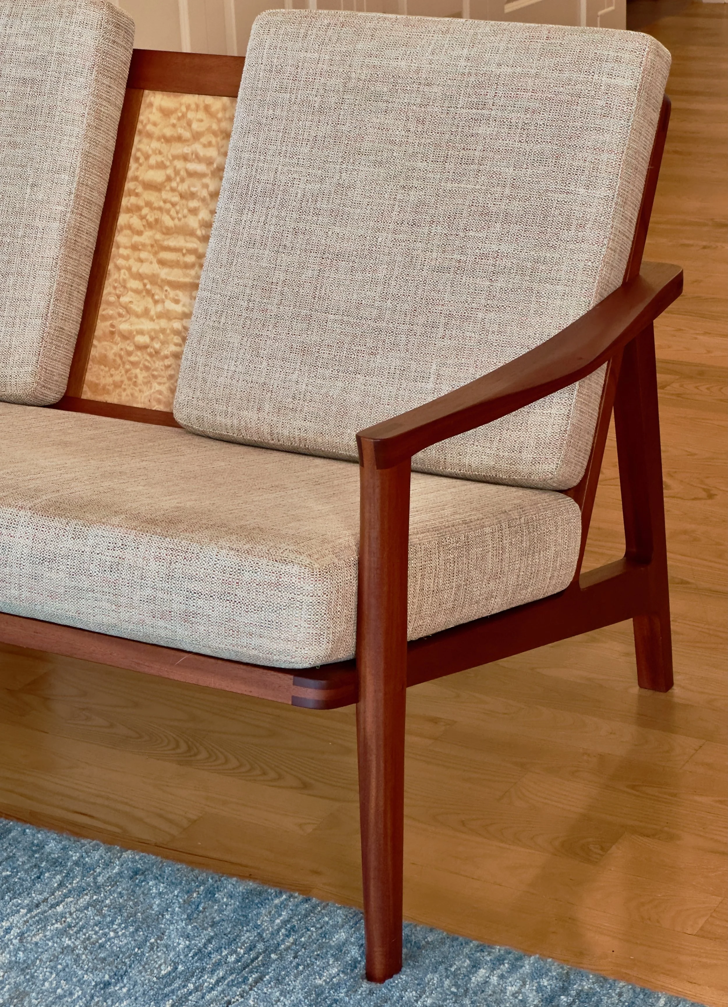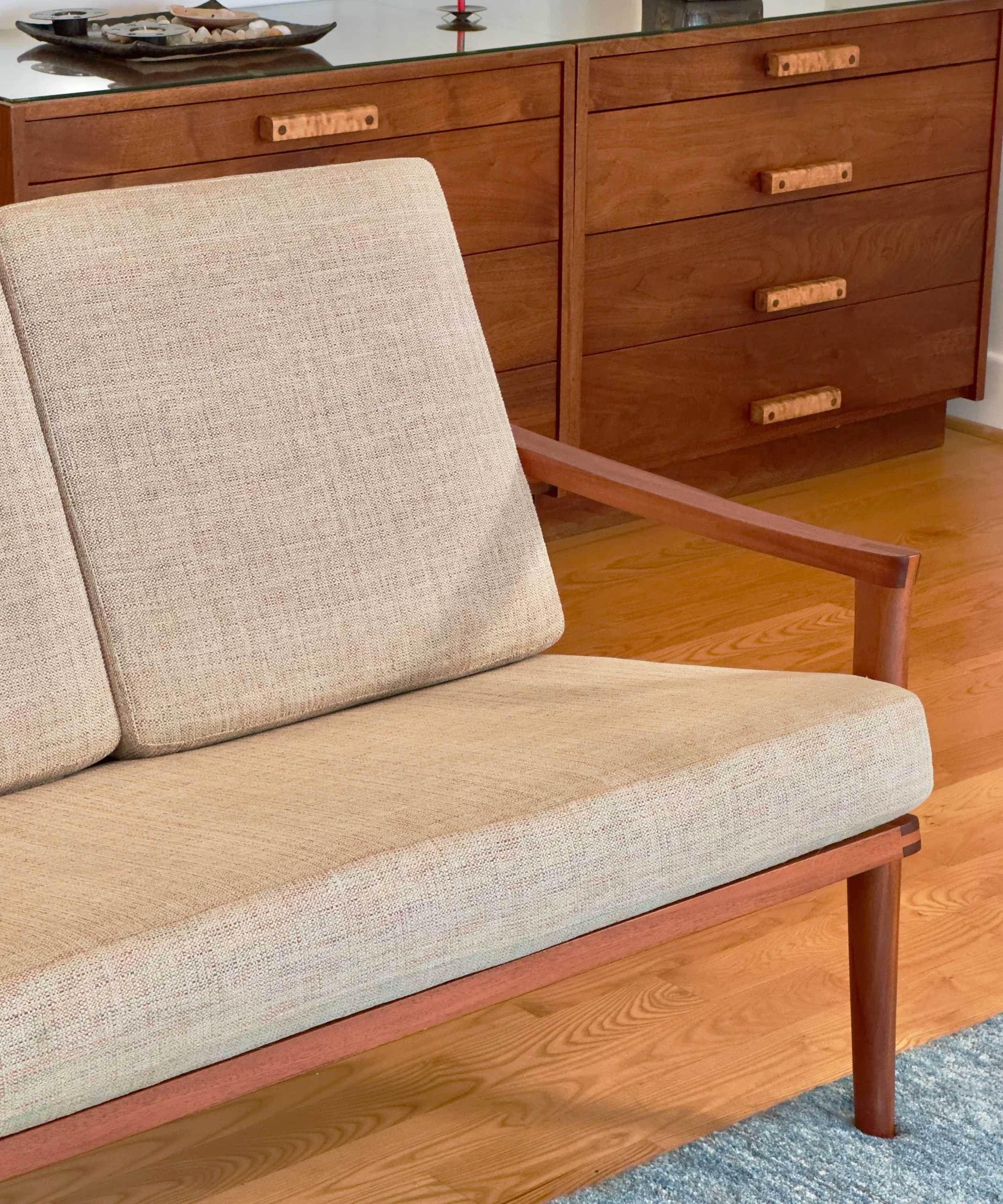 For this special returning client, I took on the engaging challenge of crafting a pair of settees that would function either as standalone pieces or effortlessly join to create a striking 7-foot sofa. Balancing elegance with adaptability proved to be a satisfying test of both design and craftsmanship.
